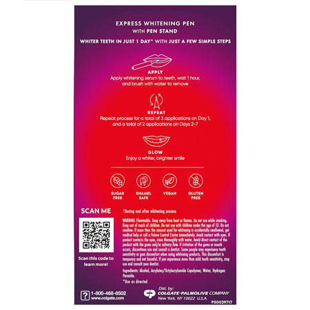 Get your smile ready for a special occasion with the Colgate Optic White Express Teeth Whitening Pen. With this advanced whitening pen at your fingertips, you?ll see whiter teeth in just 1 day* in a few simple steps. Powered by hydrogen peroxide, this easy-to-use tooth whitening pen with a precision tip applicator delivers a glowing smile after just 3 applications. It?s safe on teeth enamel and designed for effective results with no tooth sensitivity during or after the whitening process. Just click, apply and let the power of the teeth whitening gel work its magic! Repeat for a total of 3 applications on Day 1, and a total of 2 applications on Days 2-7 for exceptional whitening results. Use the Colgate teeth whitening pen daily to effectively whiten your smile and remove teeth stains. With Colgate Optic White, you can find the confidence to soak up everything life has to offer without worrying about it soaking into your teeth. Go ahead and live your life to the brightest! *When used as directed