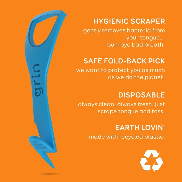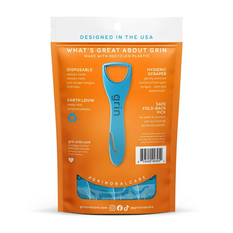 At Grin we are working hard to develop oral care products that are “simply better”. We know that we can’t save the world alone, so we invite you to live by our mantra… EARTH LOVIN’. Created by us with nothing but love, we have designed and developed a line of innovative and clinically better oral care products to simplify your daily oral care ritual. Grin… we are all about you, your smile and being better. 32 Adult Tongue Cleaners per bag. Disposable after use.